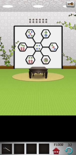 电梯门是由麻将中的一、二、三、四、五、六、七筒组成,开门的方式要让每条线上的数字相加等于12即可(四要在中间哟)。然后电梯门就打开了。 点击绿色箭头进入下一层。