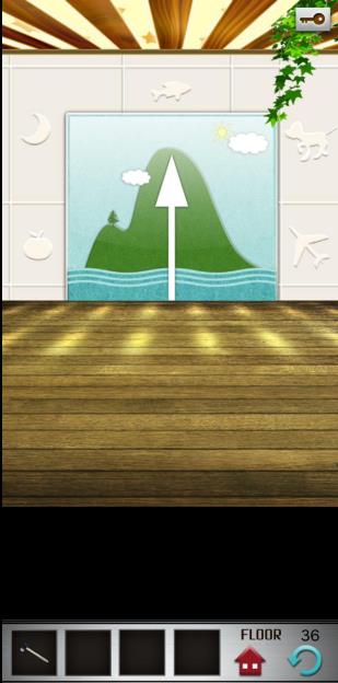 电梯门周围有鱼、狗、飞机、苹果、月亮五个图标,在电梯门上有一幅画,画的中间有一个向上的白色箭头。需要由下至上依次点击相应的图标(鱼-狗-苹果-飞机-月亮)即可打开电梯门过关。 点击绿色箭头进入下一层。