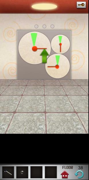 需要让三个指针在同一时刻指向绿色的区域,便可过关,根据需要旋转的角度,可以先点击最大的指针,然后在转了四分之一圈的时候点最小的指针,最后是中间的指针。这样便可打开电梯门。 点击绿色箭头进入下一层。