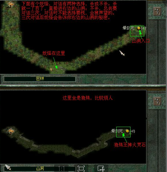 11.进大山洞:杀死(或连续3次放过)密林中的妖怪后,可以进入密林东侧的大山洞,这里面都是狍鸮,在山洞里面杀死狍鸮王,可以得到“火灵石”。