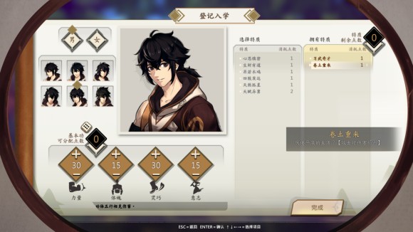 开局属性如图,因为六月的传令对力量和灵巧有80要求,所以这两个初始属性多点一些。天赋选习武奇才。(二周目开始多一个天赋点,这里我选卷土重来,只影响战斗体验,总体上不影响我们养成。)
