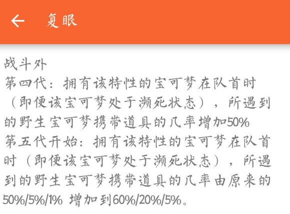 复眼特性可以提高野生精灵携带道具的概率。如果需要偷道具卖钱,这个特性的精灵一定要带上哦!