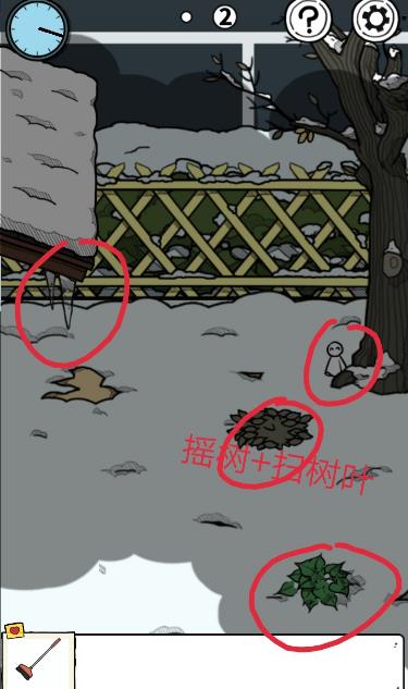 【拿起屋内的扫帚】,来到【右边的后院】,咦!天色好暗…不要紧开始工作吧!从【右下角的绿色树叶堆里】翻出【生红薯】,点击一旁的【大树】,摇下来【一地叶子】,【用扫帚把树叶扫在一起】,【把生红薯放进去】,接下来就是想办法生活烤红薯了!看到屋檐下的冰棱和树下的晴天娃娃,有什么想法没?对了!凸透镜聚焦取火!【用扫帚打下屋檐下的冰棱,并拾取】,【捡起地上的晴天娃娃挂在屋檐下】,天晴啦!【把冰棱放在树叶堆上,不一会儿点燃树叶】,得到香喷喷的烤红薯,拿给屋内的姐姐。搞定啦!