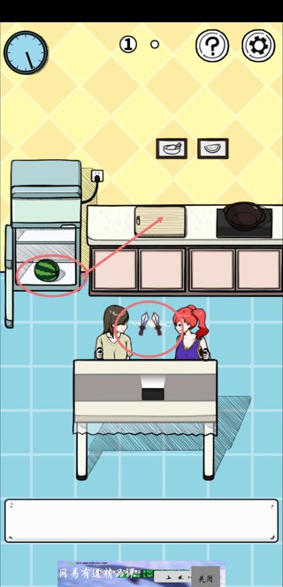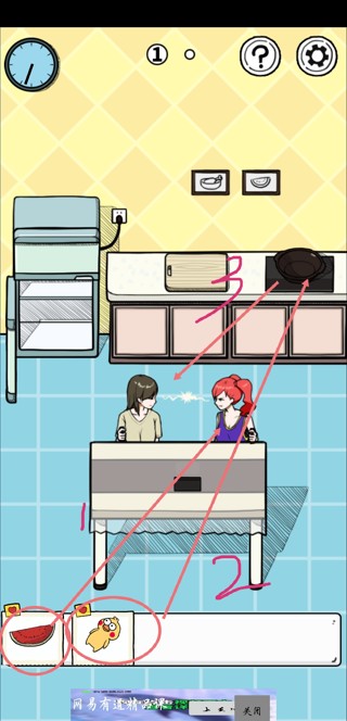 2.散开的游戏机放在第一页两个小姐姐桌子前。他们玩游戏目光含剑,抽出来把冰箱的西瓜放在案板上切成两块。
