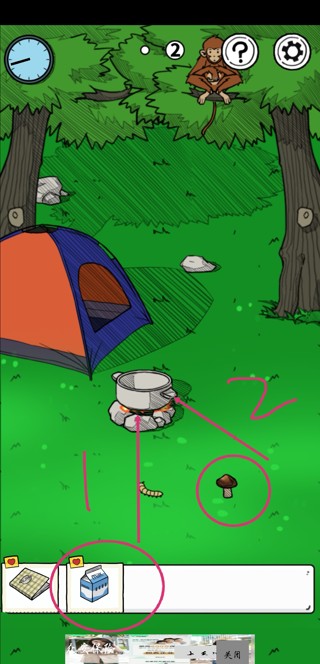 3.把第二页树上树枝拿下来放在石坑里点火,把锅放上去,牛奶倒进去,蘑菇放进去。得到蘑菇汤,赶紧趁热给小姐姐拿去吧。