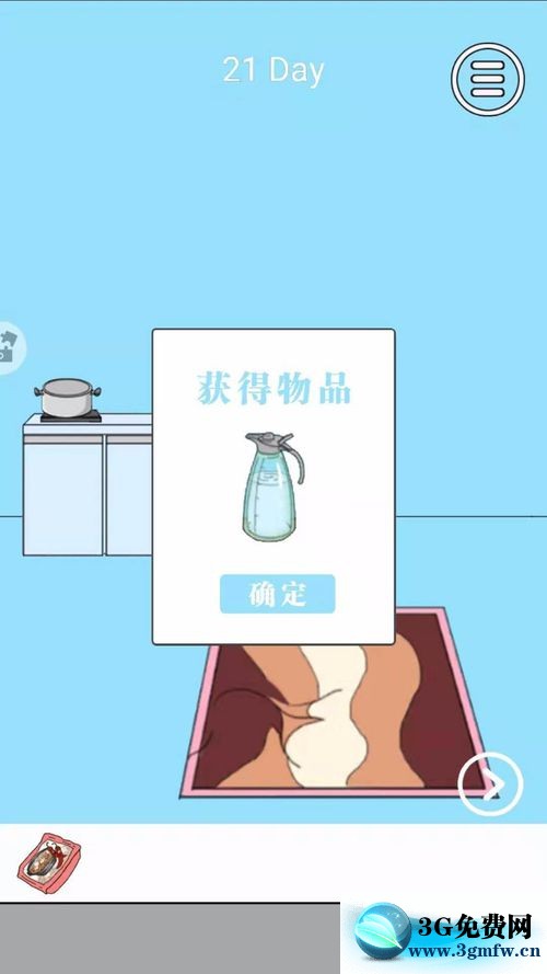 这时就可以拿到食物,再翻到第一页,点击柜子上的水瓶,然后拖放到锅上,水倒入锅里,再把食物拖放在锅里,这样就可以过关了,如图所示