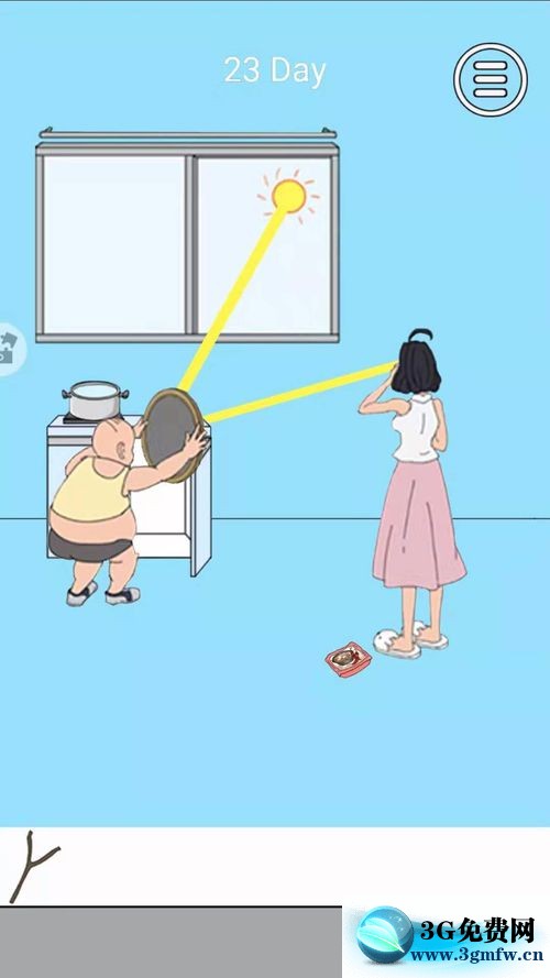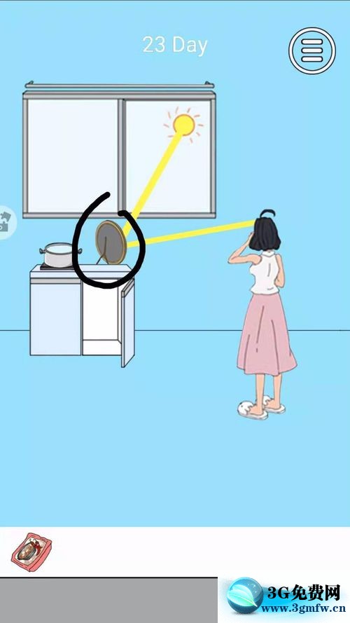 将镜子拖放到太阳上,这时就会出现太阳光通过镜子反射到妈妈的眼睛上,食物掉在地上,这时别去捡食物,不然就失败了,如图所示
