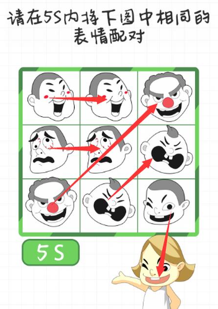 答案:手速一定要快,最后一张图与下面小人消掉,在9宫格内,点击相同的表情,多出的一个表情与下方的人表情是相同的。