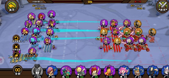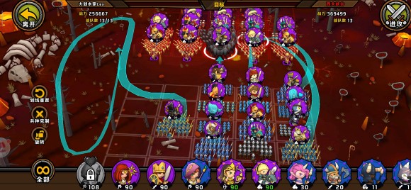 tips:最边路可以不要前排,法师弓兵放第一排,骑兵放第二排,然后骑兵从侧翼突进后排的时候就可以引走对面骑兵,这样法师弓兵可以先手输出。