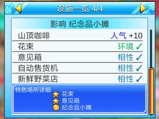 客人通过使用设施可以兴趣和满意度一起上升,每个设施的上升值不同,但是可以加成,主要通过放相性好的设施在一起可以加成