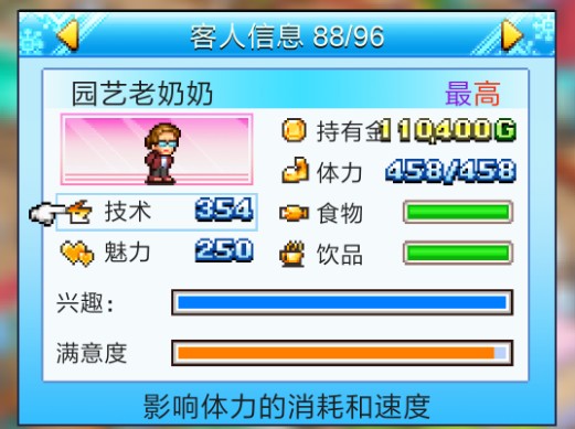 前面基本没什么太多的问题,基本大同小异。设施则是最大差异,而且最影响整个游戏的进程。设施作用除了吸引新的客人和锻炼客人还有2个主要作用:提升满意度和赚钱。满意度似乎是无限的?每满一次就会上升金钱最大值,每个客人的上升值都是固定的,其中最多的是一位老奶奶,一次上升800。金钱上限很关键,要不再贵的设施客人没钱也不能消费几个从而赚不了多少钱
