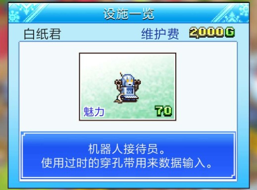 冬天80魅力(11月~4月),春夏秋30魅力(5月~10月),即80*6+30*6=660,不如机器人的840,但是维护费低,前期放也可以。而且客人一般冬天人多而且狂热也多还能收素材强化设施。入手条件:赞助商圣诞老人