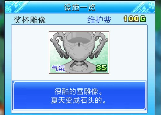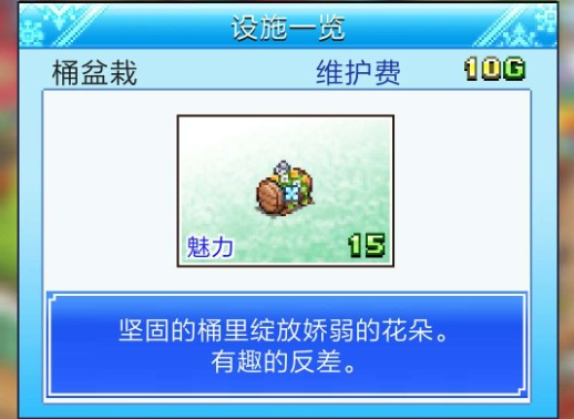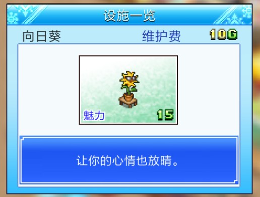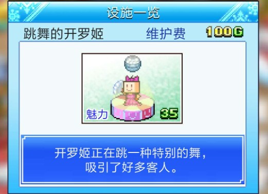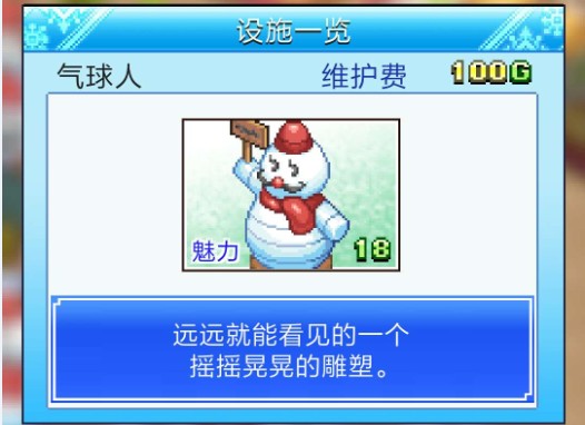 设施就是放在店内的,设施主要有两种属性可以增加使用的费用,一个是人气一个是魅力,人气每5点加2的使用费,很少基本没用,人气主要是用来升级滑雪场。另外一个是魅力,每1点魅力加5的使用费用。所以要想赚钱还是要叠魅力了。有些设施是无法被使用,但是可以增加周围设施的魅力的,范围是自己为中心的两圈,下设施前可以看到的格子就是范围