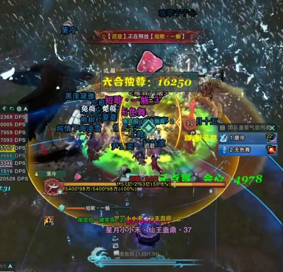 短歌·月落(点名2/6/?个玩家获得月落BUFF,可驱散,也可等时间结束,内功伤害,目前伤害不算很大,BUFF消失后,会在原地留下音障圈,用于躲避问莲。)