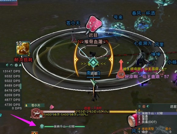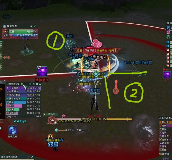 泉映千山·幻歌(从BOSS脚下放出4次环状技能,内功伤害,需要二段跳过去,没跳过去则会封内5秒,同时BOSS脚下6尺范围内会有持续伤害范围圈,虽然不会封内,但是会叠减疗BUFF,处理方法可以提前退出去,环技能来的时候助跑跳过去,扶摇也可以规避。如果熟练的话建议和BOSS卡7.5尺左右,等BOSS读条变绿后起跳,等身体开始向下的时候接个二段跳即可)