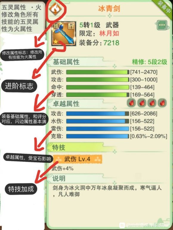 这把剑闪边,基本是满属性,锻造装备的时候会随机出现修改技能属性的标志,它可以把角色的所有技能的属性攻击都改成这个属性,比如你是酒剑仙,你的装备左上角是火,你本来技能都是雷属性攻击,但是装备了这件火属性装备之后,你的技能就都变成火属性攻击了,所以这里会导致一个问题,你属性都加的雷,你的雷属性有1万,而火只有1000,装备使你技能都变成了火属性,那么你的伤害会大打折扣,这就是它的最大缺点,当然也有优点,比如你是赵灵儿,仙灵是火和水,而火是主属性,当你造出都转化为火的时候,你就没必要去堆积水属性,伤害会得到很大提升