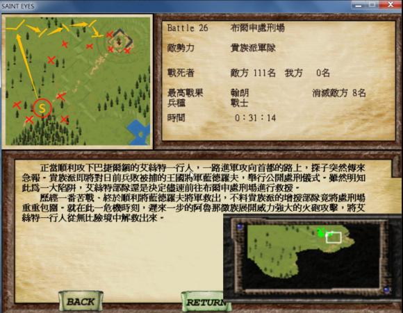 最后只要把刑场周边清理了,就可以过关(还想多练练兵的说)。其实可以杀回去,把敌人都清掉。但是到达最后阵线时,僧侣都没有蓝补血了。