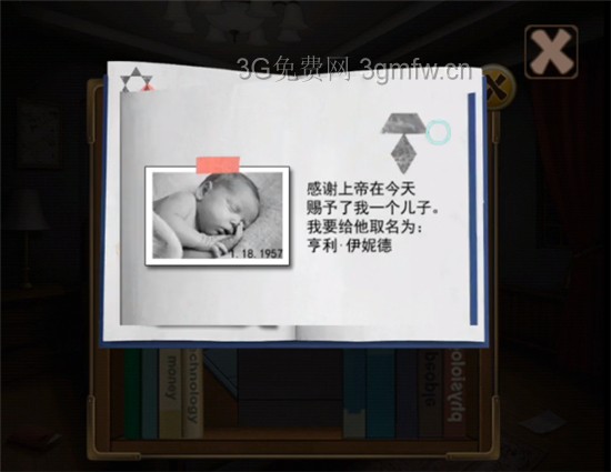 打开得到一个文件夹,可以收集到亨利的照片,另外需要注意的是文件夹中的四个符号,这个是床头柜那里的密码。注意一点就是密码顺序并不是按照左右或者上下排列,而是根据出生和成长情况排列的,年龄从小到大,出生照片是有时间作为参考物,其他几张有时间的话就算出来和出生日期的差距,没有时间只写有年龄的就用出生年往上加(解释的很清楚了,出生照片那里的符号最小是第一位,18岁最大是最后一位这样)。