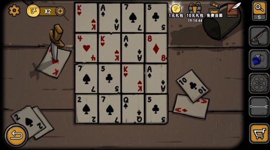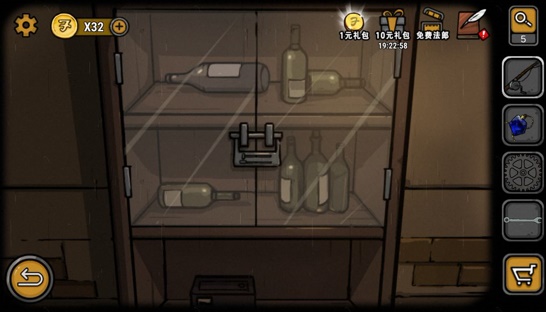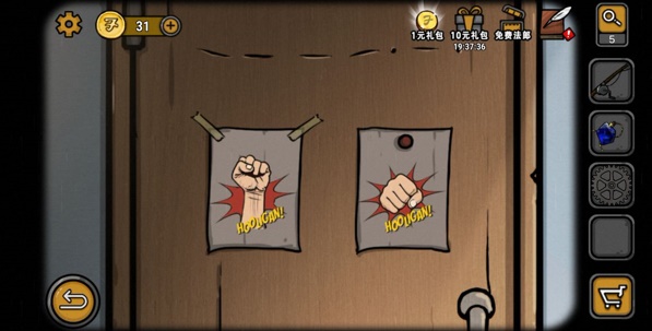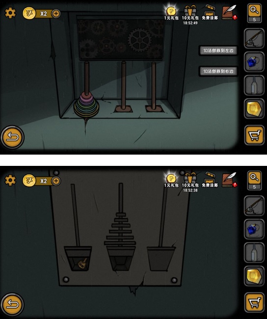 出了酒吧,来到酒吧后巷右侧,可怜我的小老弟饿了几天了,我赶忙掏出面包给他吃。然后再来到后巷左侧,用扳手拧开通风管钻了进去。通过通风管左侧,来到了一个卧室,从地板上捡起了一块木板,又从门口的抽屉里翻出了一本家谱,这家谱却正对应了宝盒的密码(MNAJSK),从宝盒里得到了半个圣杯,还好不是一个,不然这个小镇也得核平了。掀开墙上的小丑挂画,将背后的汉诺塔游戏先完成中间那次,打开了墙上的机关,放入齿轮。再完成左右两次,对应的打开了房间左侧海报上的两个暗格,得到了钥匙。