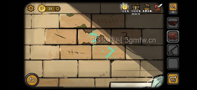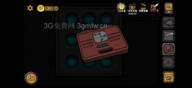 (顺序是1234567,把左上的两块青苔视作2)出来后,从菜店的波尼太太处得到了鱼竿用开锁工具打开了维修店的侧门(顺序41532)进门,摸到齿轮、胶水、铜线和工具箱。打开墙上的两个按钮和一个拉闸,再将电箱上的九个灯泡全部点亮,上面浮现的字母对应工具箱表面的图案,得出密码是BKVF,打开工具箱得到新的零件轴。