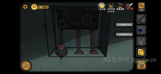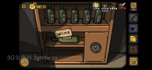 来到另一边的酒柜,将酒瓶摆放成angel天使的字样,在放入半个圣杯。又在边上的天使雕像托盘处,将宝石按童谣的顺序摆入(红黄绿蓝),一间密室便打了开来,目标的白兰地即刻入手