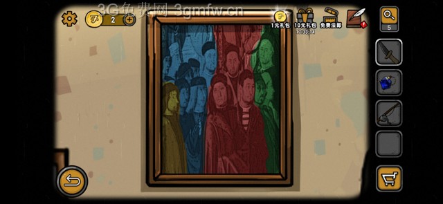 二楼房间的一副画吸引了我的注意,让我情不自禁的打开了书架上的箱子(黄1蓝7红3绿3,即画上不同色区的人数),拿到了抽屉把手之一,再加上地上捡的另一个抽屉把手,这样衣柜抽屉里的德芙就是我的了