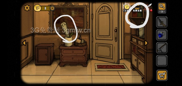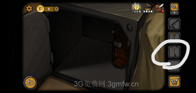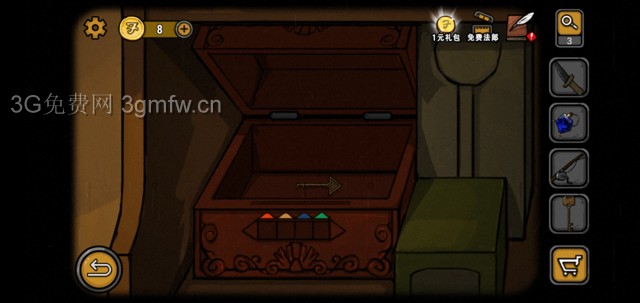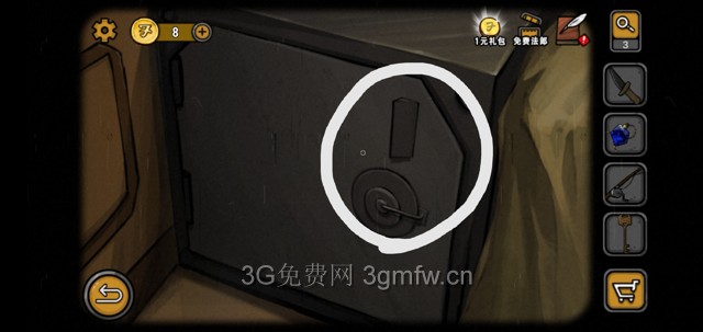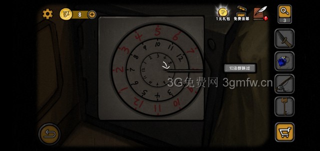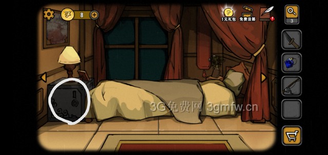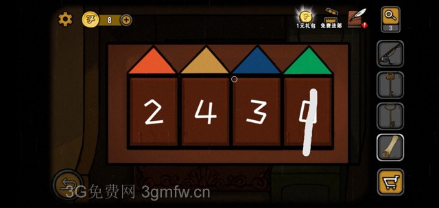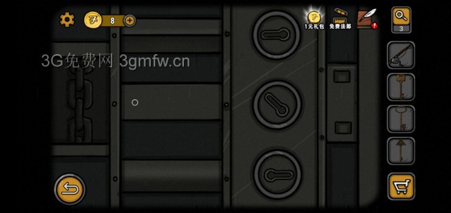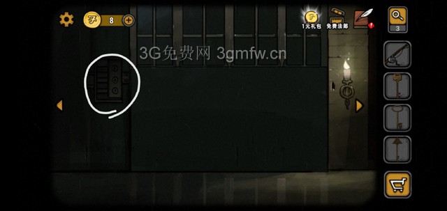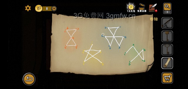 拿到发条,放进钟的上面 关注钟指针的位置,对应床头保险柜的密码 从里到外为5 1 8 拿到第二把钥匙?! 拿图纸,点右上的红盒子 连线后求三角形个数,对应密码为2 4 3 1 第三把钥匙?Get! 去地牢,小姑娘被刀疤带走了,记住图锁的旋转角度