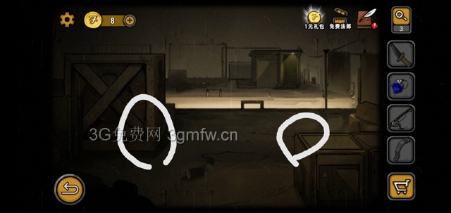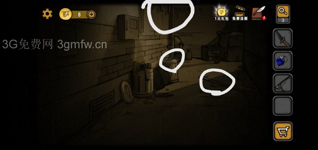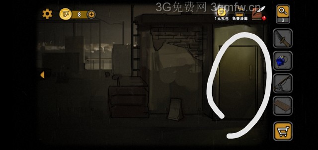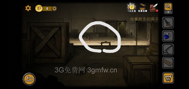 捡铁环,木棍,勾一下旁边的楼梯,爬上去