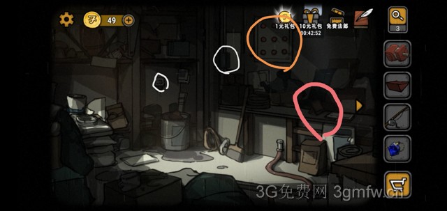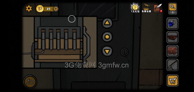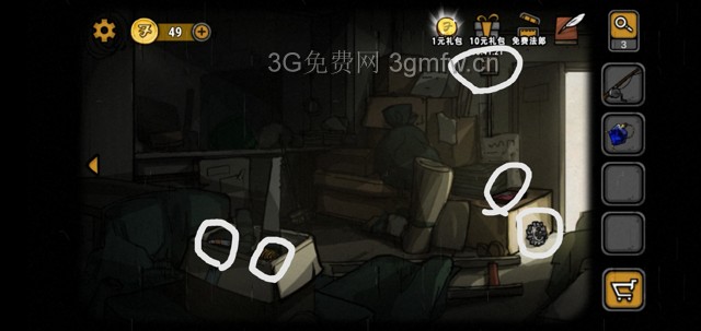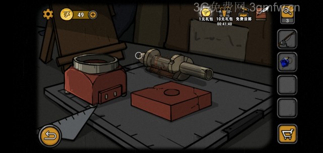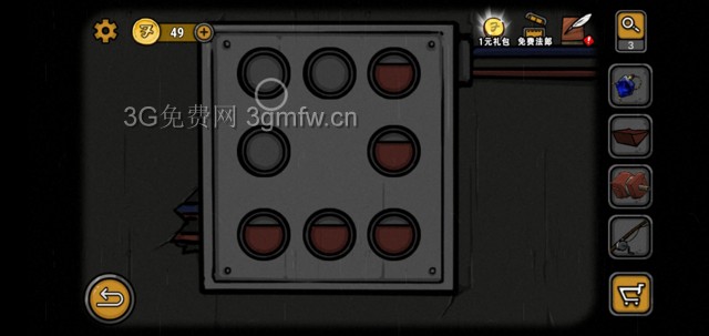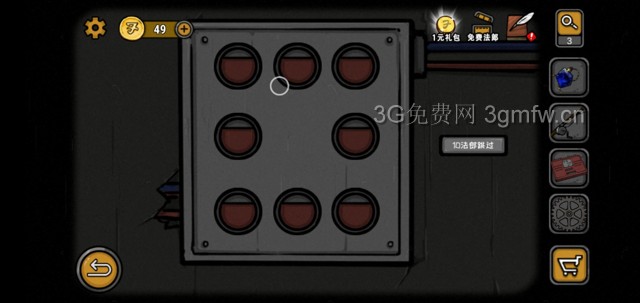 先点黄圈,少了三个红点;打开两个白圈里的开关;红圈是工作台,零件摆上去
