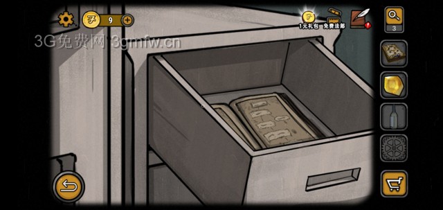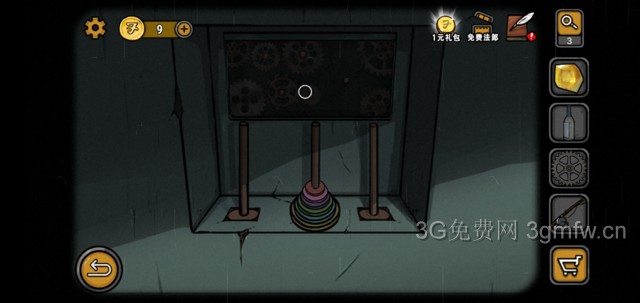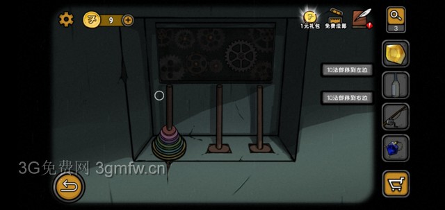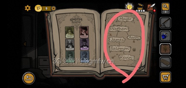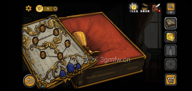 先去左边 柜子里有族谱,右边是叠高高小游戏 根据族谱,顺序是MNAJSK,打开宝匣,拿到金杯 叠高高,先移到中间(游戏不难,就是费时间) 齿轮放进去,去左边房间,拿木板,叠高高机关 移到左边 拿半个钥匙 移到右边