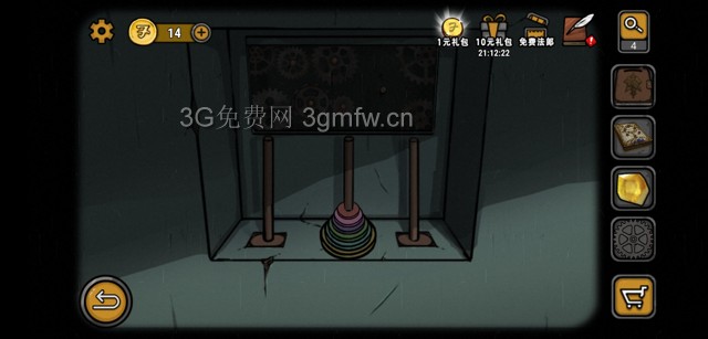 提交十块钱通关小游戏后(游戏规则:将所有的圆放在同一个柱子上,要求最大的在下方,小的在上方。圆可以任意移动,但是大圆不能放在小圆上方。会玩儿的自然会,不会玩儿的花十块钱跳过吧。),发现后面居然有齿轮装置,突然想到了从机械商店顺手牵的齿轮,装上再说。