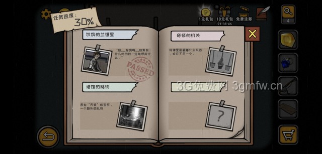 向后转我们又发现了一个形状奇特的机关,并且顺便拿了一块木板(虽然不知道有什么用,但还是拿上吧)。打开任务记录,任务提示也作出了说明,不止一个道具。花十块钱挪到左边拿钥匙的一半,再挪到右面又拿个钥匙的一半。两个一半合成一个钥匙,岂不美哉?