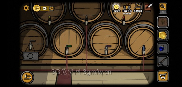 继续往里走,遇到N个酒桶,按照黄红灰蓝顺序依次打开,红宝石get✓