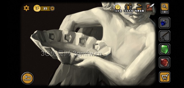 看到它手捧的盆子上面四个凹槽,依次放入红黄绿蓝四个宝石。