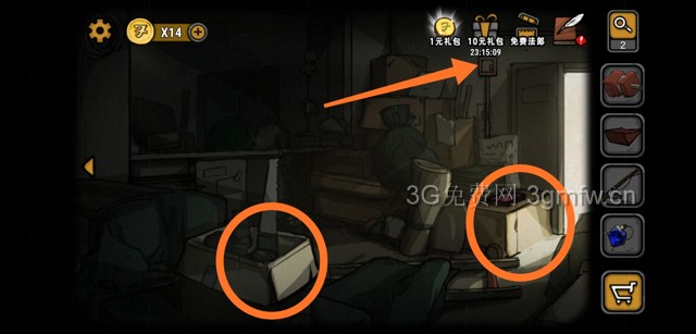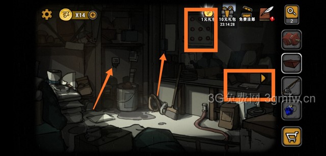 进屋后例行搜索一番。获得铜线、胶水、齿轮、工具箱(圈圈位置),同时打开三个开关(箭头位置)