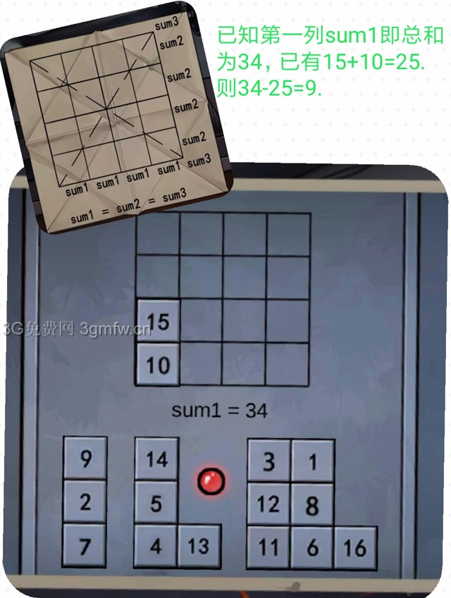 之后在根据纸条得出所有行列相等都是34,进行推算,把11+6+16=33这一排放上去。14+5+4=23数列就有目的地了整体就放完了。到这里检电池,然后女警察就消失了!