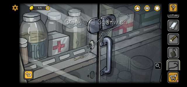 回到医务室,在之前放托盘的地方有一本蓝色本子,打开后发现左边页有红色的字母,根据其打开左边桌面上的医药箱,取得钥匙。用钥匙打开下方的锁,获得一字螺丝刀头和SG-01钥匙。拆掉十字螺丝刀,装上一字螺丝刀头,点击右侧柜子,用其拆除上面的螺丝,再用铁丝取出钥匙。