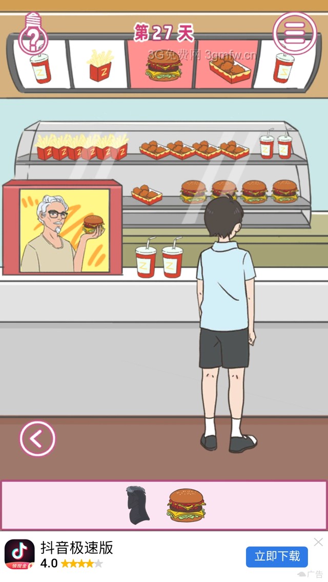 在这里获得白色头发男子的外套,点击顶上的汉堡宣传牌获得汉堡。把衣服给女主穿上,打开女主左上方的窗,有把手的。等那个男生离开后,再把汉堡给男主第二十八关