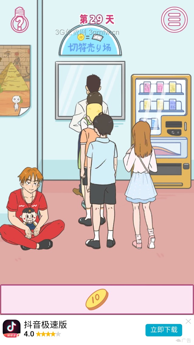 在男主裤兜中获得钱,放入旁边的自助购物机中,获得烟,给旁边的做着的工作人员获得两张票,把票放到男女主中间第三十关