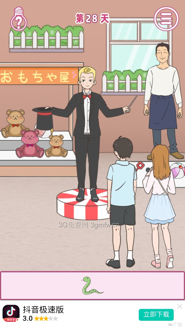 点击蛇玩偶放入魔术帽中,点击那个男生让他表演,他会被吓到掉下魔术帽。魔术帽给男主表演第二十九关