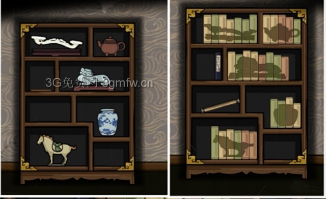 2.点击右边书柜拼好柜中5样物品,再根据右边柜子的图案对应左边的柜子中的实物(注:左边柜子必须根据物品的大小移动到合适的格子,和现实中一样要拿起一件东西再放下另一件东西)