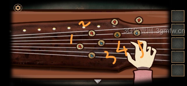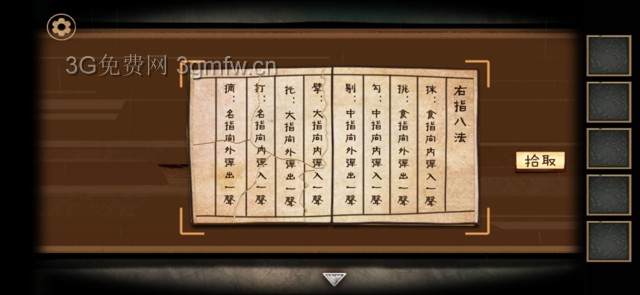 7.用钥匙打开红色柜子,获得⑱琴弦2。把琴弦放在古琴上修好古琴。在夫人桌上放上《琴谱》拼好残页,根据夫人要求的:托、挑、抹、勾、打与琴谱点击女二弹琴。(女二弹琴手势从下往上别是:红色-托、挑、剔、摘。蓝色-劈、抹、勾、打)