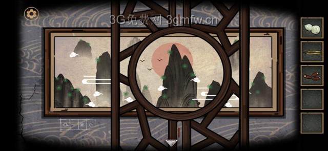 4.来到日出的画作前,把镂空屏风间对齐红色中线。根据左下角的提示,按顺序数出圆圈内☁️×2 ?×3 ?×8 ⭕×1。即左边书柜下的柜子密码为:2381,获得④榔头。