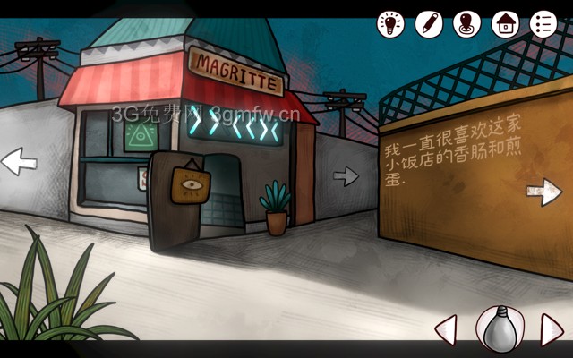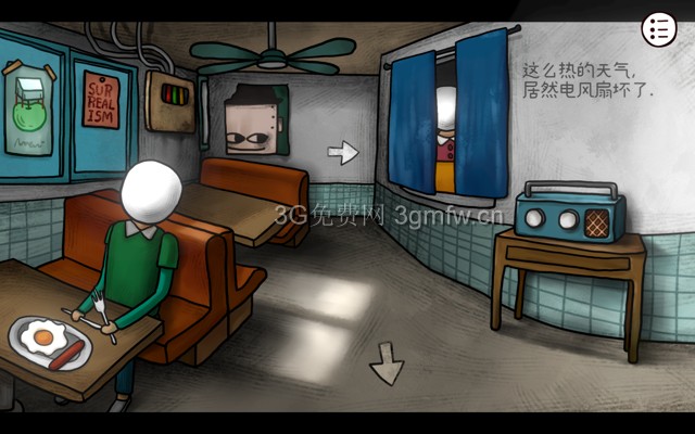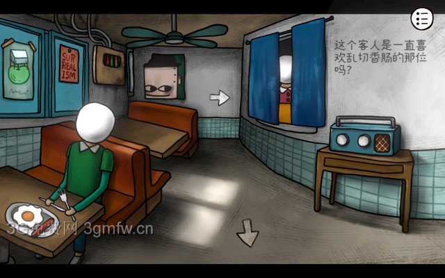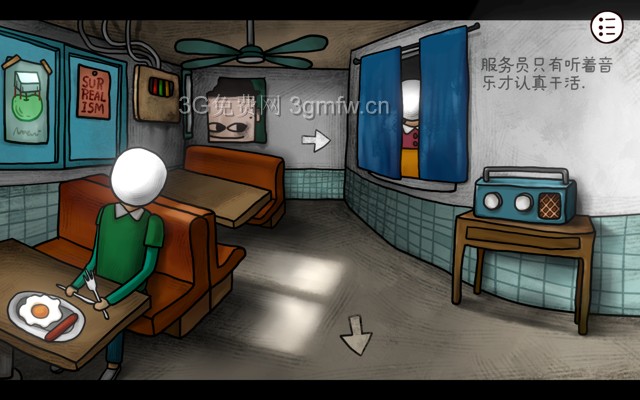 进入第二个场景快餐店,点击墙上的字。前传这一部改变了以前的对话框式交流,改用旁白,是一个比较让人耳目一新的点。