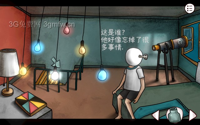 从道具提示可以知道,发条可以找回记忆,对应家里二楼的旁白,所以回家,把发条安在二楼那个人的头上。