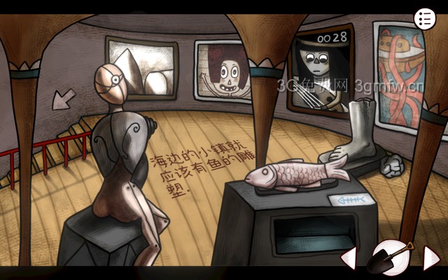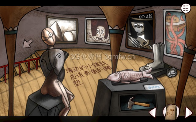 由画廊二楼的旁白可知这里缺少鱼的雕塑,把石头鱼放在右下的台子上(旁边有鱼骨标志)得到锤子