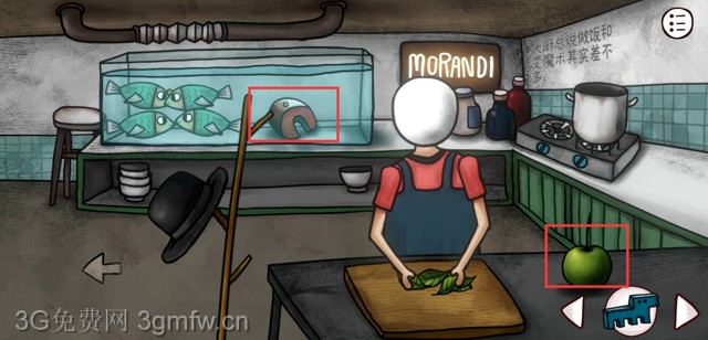 回到餐馆来到厨房把瓶子送给厨子拿到苹果 鱼饲料喂鱼拿到磁铁