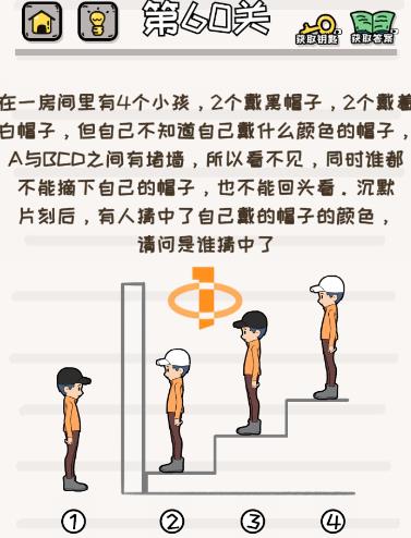 在一房间里有4个小孩,2个带黑帽子,2个带着白帽子,但自己不知道自己戴什么颜色的帽子,A与BCD之间有堵墙,所以看不见,同时谁都不能摘下自己的帽子,也不能回头看。沉默片刻后,有人猜中了自己戴的帽子的颜色,请问是谁猜中了是《挑战小学生》第60关的问题,很多网友不知道答案是什么,下面小编给大家带来挑战小学生第60关攻略。
