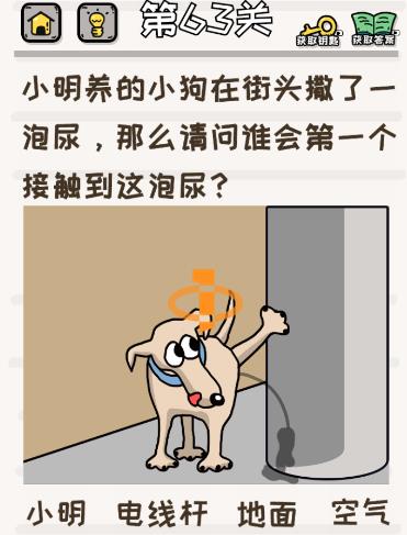 小明养的小狗在街头撒了一泡尿那么请问谁会第一个接触到这泡尿是《挑战小学生》第63关的问题,很多网友不知道答案是什么,下面小编给大家带来挑战小学生第63关攻略。