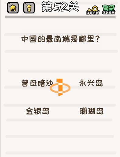 中国的最南端是哪里是《挑战小学生》第52关的问题,很多网友不知道答案是什么,下面小编给大家带来挑战小学生第52关攻略。 问题:中国的最南端是哪里? 答案:曾母暗沙(位于中国南海,南沙群岛的一部分) 老友网www.andlaou.com免费为你分享